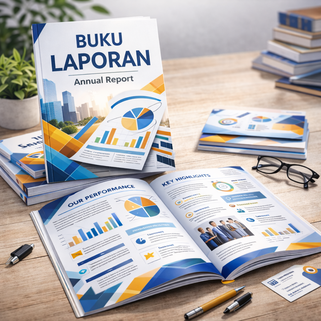 Layanan desain dan cetak laporan tahunan perusahaan dengan tampilan profesional, rapi, dan berkualitas tinggi untuk kebutuhan resmi dan corporate.