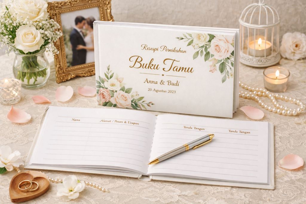 Buku tamu resepsi pernikahan berfungsi sebagai media pencatatan kehadiran tamu yang datang ke acara